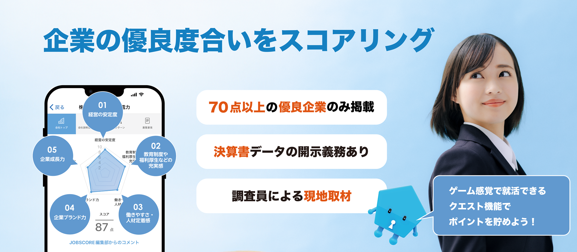 ジョブスコアでは、こうした決算データにもとづく経営の安定性を、独自のスコアとして分かりやすく可視化しています。数字の裏側にある企業のストーリーを読み解きながら、地元でも、地方でも、本当に安心して働ける会社との出会いを、ぜひ自分のものにしていきましょう。